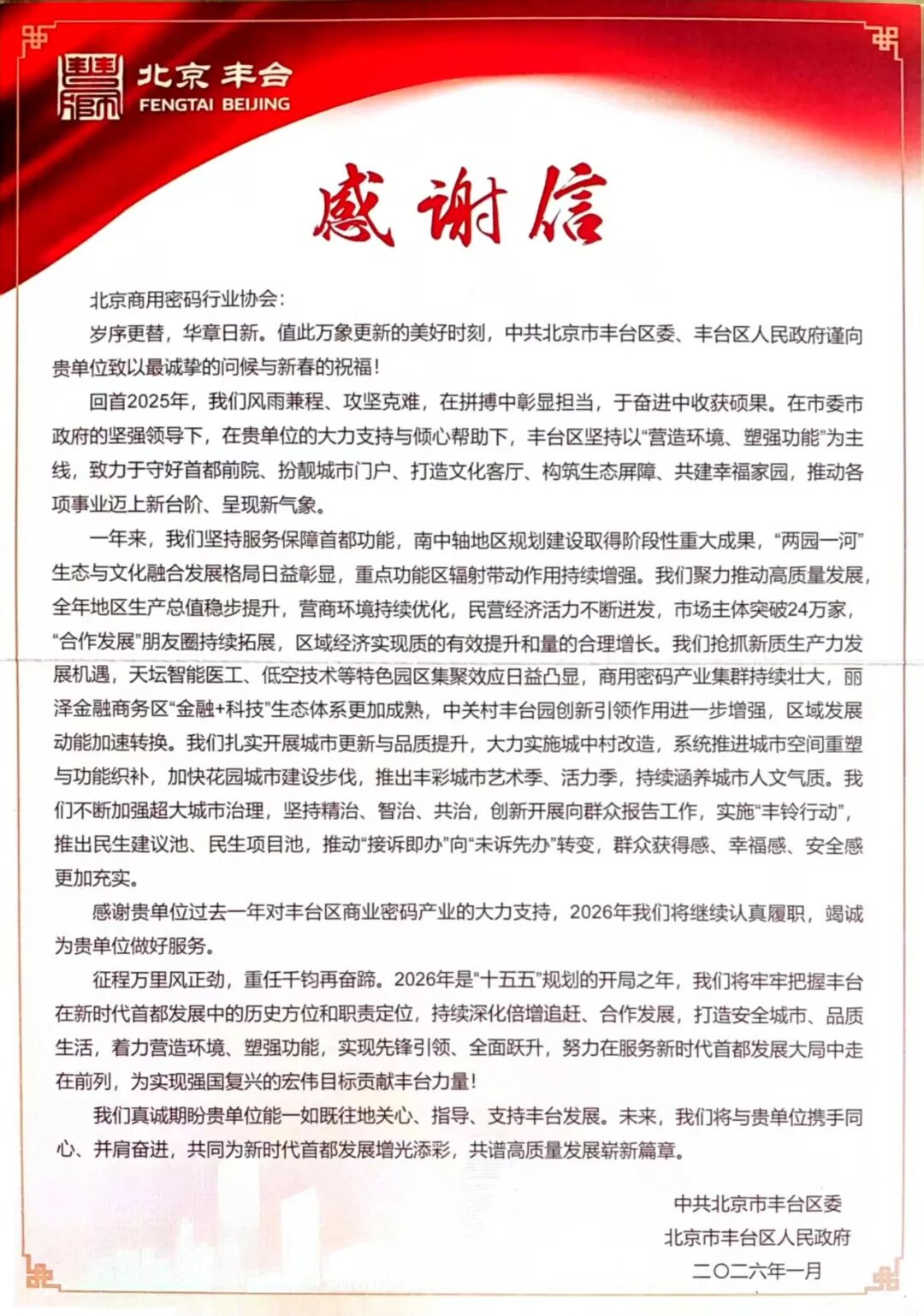 协会获中共北京市丰台区委、丰台区人民政府感谢信!